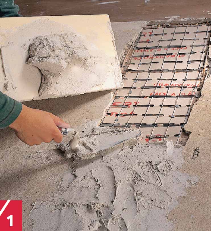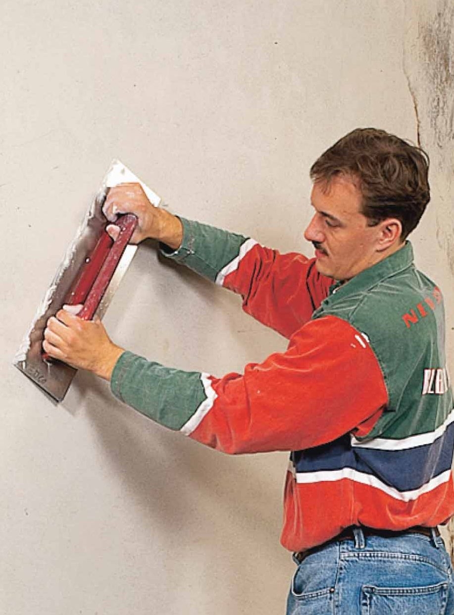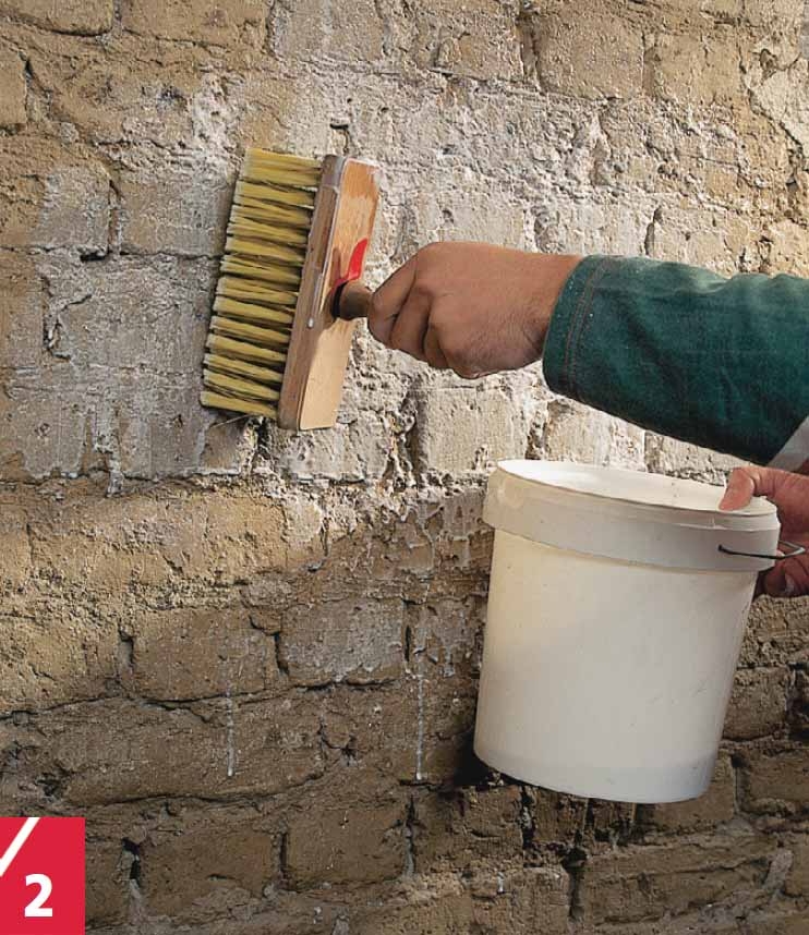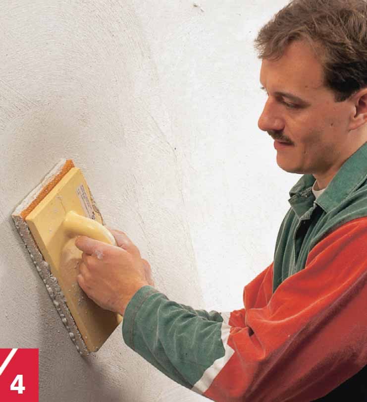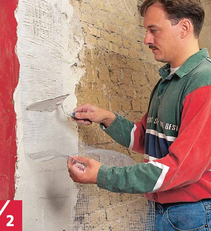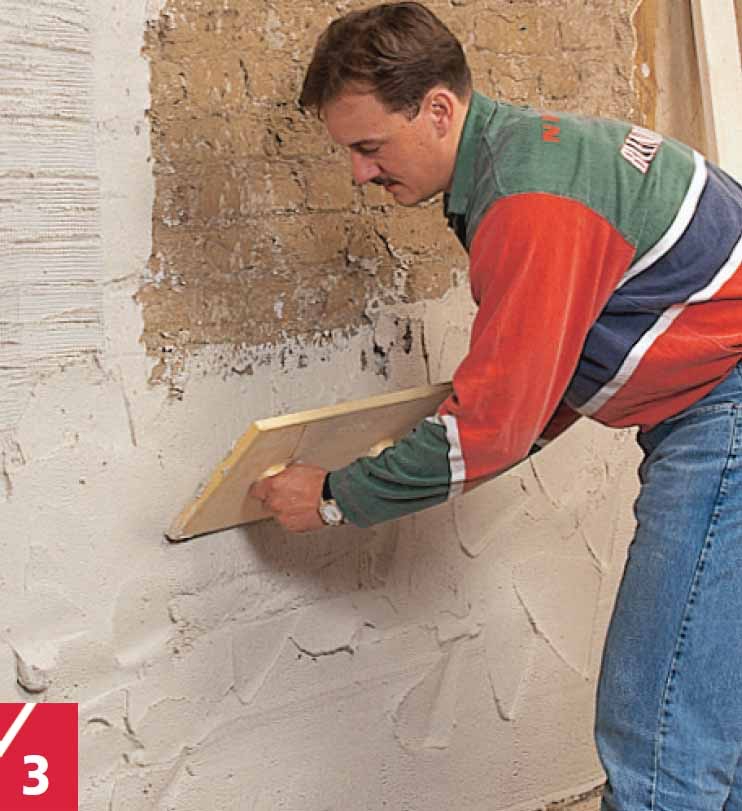 Ensin täytetään syvät alueet ja kulmat. Varsinkin hauraat alueet käsitellään tartun-taemulsiolla ennen kuin verkko kiinnitetään ja kipsilaastia levitetään muurauskauhalla. Suuret alat voi täyttää hiertimellä.