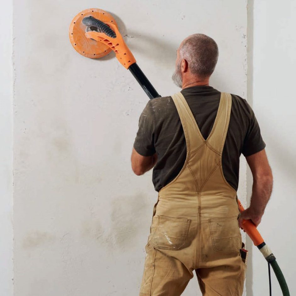 Hio koko seinä sileäksi. Voit hioa seinän käsin, hiomatuen avulla tai käyttää varsihioma konetta. Pitkäkaulainen varsihiomakone hioo isot pinnat nopeasti ja tasaisesti, ja siihen voi liittää pölynimurin. Siitä on hyötyä, sillä kipsi tasoite pölyää!
