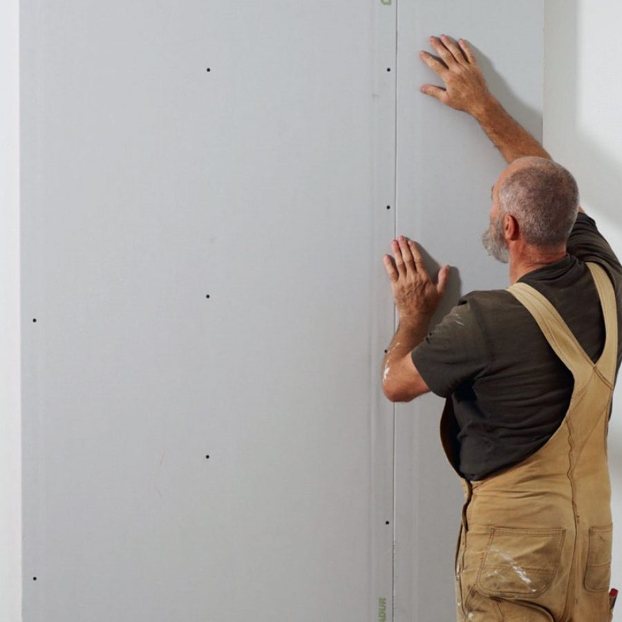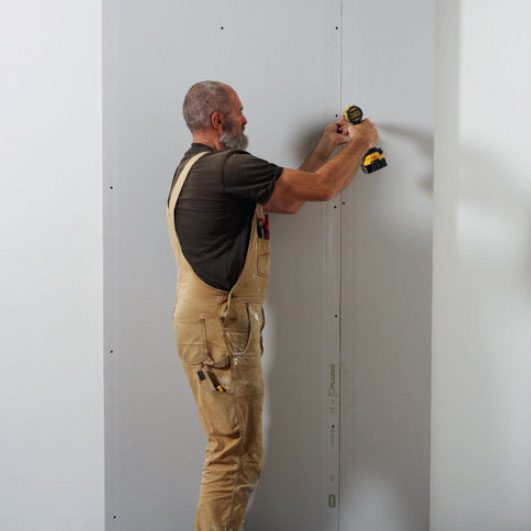 Ruuvaa kipsilevy kiinni. Levyt on helppo asentaa puualustalle, sillä ruuvit tarttuvat kiinni joka paikkaan.