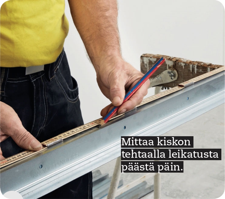 Asenna lyhyet pystykappaleet yläosan ja yläkiskon väliin. Ne asennetaan niin, että ne sopivat seinän muiden pysty-tolppien palkkiväliin, joka on 45 tai 60 cm riippuen kipsilevyjen leveydestä.