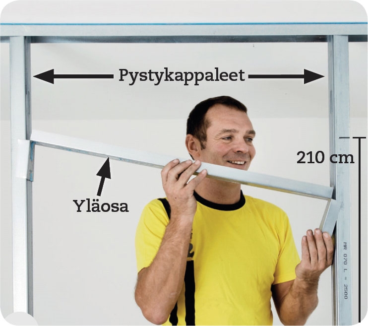Aseta taivutetut laipat kahden pystykappaleen päälle. Yläosan ala-reunan pitää sijoittua 210 cm valmiin lattiapinnoitteen päälle. Kiinnitä laipat pystytolppiin kiinnityspihdeillä tai ruuveilla.