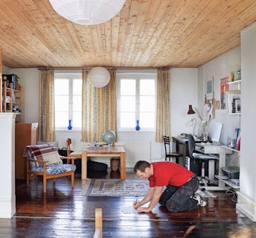 Sahaa levyt oviaukkoa varten. Kipsilevy jatkuu oviaukon reunaan, jonka jälkeen se sahataan ovitolppien reunaa pitkin sopivaan mittaan vanhalla käsisahalla.