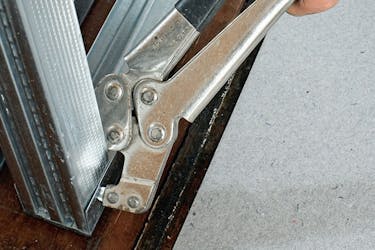 Pystytä pystytolpat. Tolppien väli on 450 mm mitattuna tolppien keskikohdasta keskikohtaan. Nämä mitat eivät koske ovitolppia. Purista pystytolpat kiinni päälli- ja pohjakiskoihin kiinnityspihdeillä.