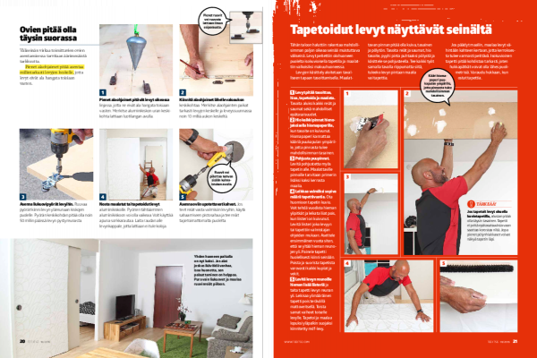 Jos päädyt maaliin, maalaa levyt vä-hintään kahteen kertaan, jotta kerrokses-ta tulee varmasti peittävä. Isokuvioinen tapetti pitää kohdistaa tarkasti, joten hukkapätkät voivat olla lähes puoli-metrisiä. Varaudu hukkaan, kun ostat tapettia.