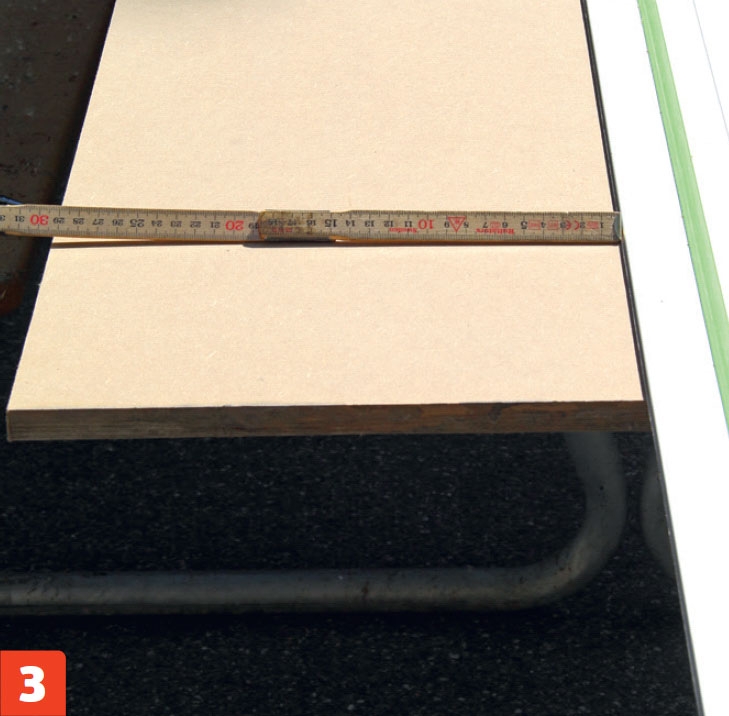 Sahaa seuraavaksi pala mdf-levyä, joka peittää sekä palkin että siihen kiinnitettävän alumiinikiskon. Tee levystä aukon mittainen.