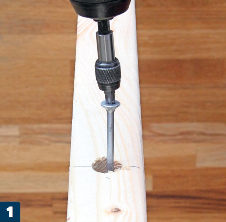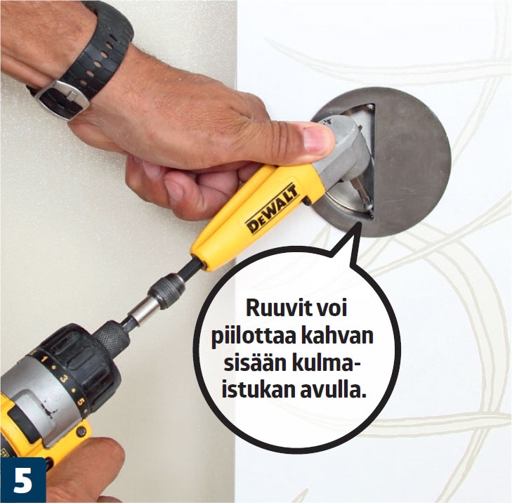Poraa aluksi alariman läpi nelimillinen reikä. Tee pintaan 14 milliä syvä reikä 10 millin terällä, jotta ruuvin kanta uppoaa pinnan alle.