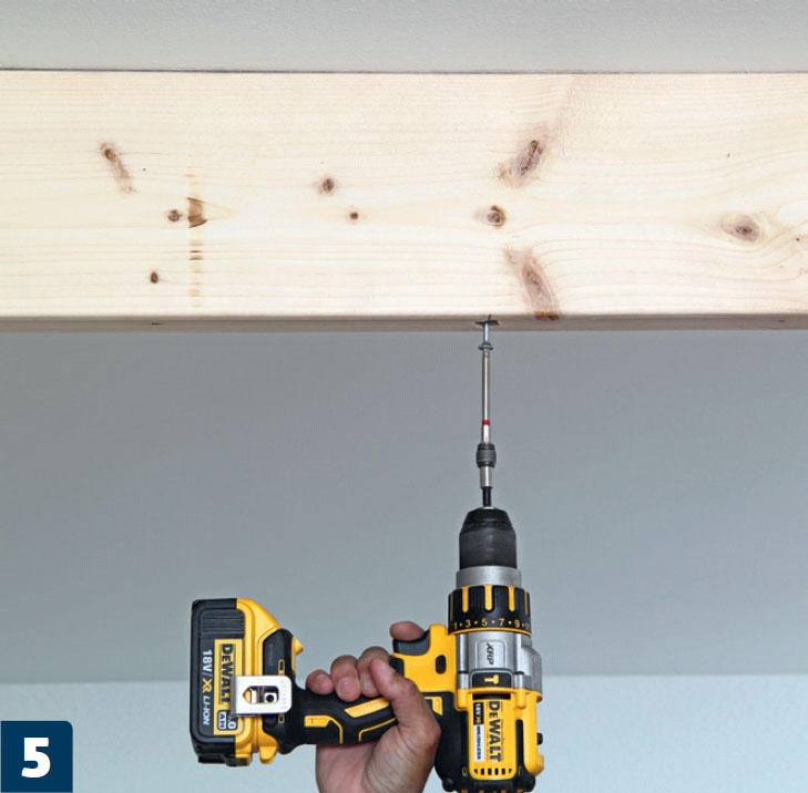 Poraa palkkiin valmiit reiät, ennen kuin kiinnität sen kattoon. Käytä noin 14 millin terää ja poraa reikä palkin puoliväliin asti. Kiinnitä palkki kattoon 180 millin ruuveilla.