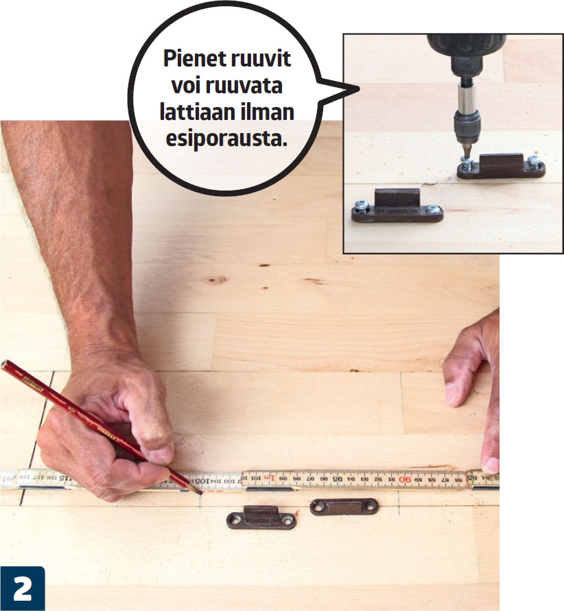 Ruuvaa lankku kiinni 180-millisillä ruuveilla. Varmista, että kaikki ruuvit uppoavat lankkuun poratun reiän pohjaan asti.