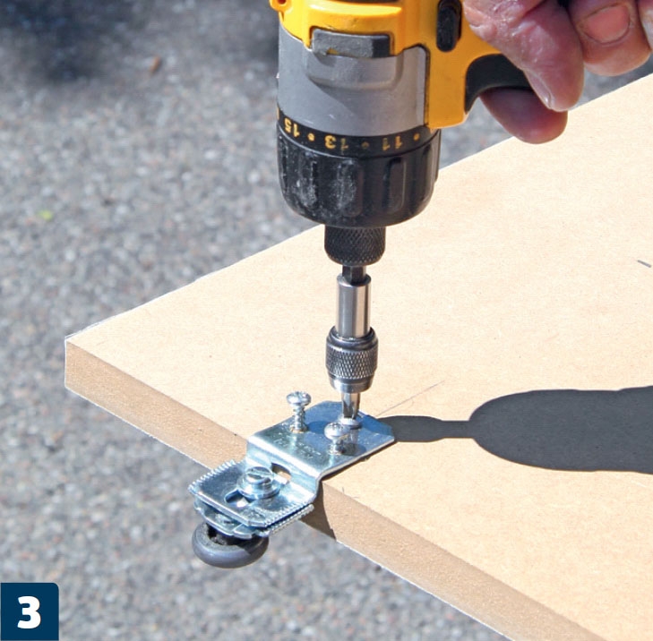 Asenna liukuovipyörät levyihin. Ruuvaa pyörät kiinni levyn yläreunaan kiskojen puolelle. Pyörän keskikohdan pitää olla noin 50 millin päässä levyn pystyreunasta.