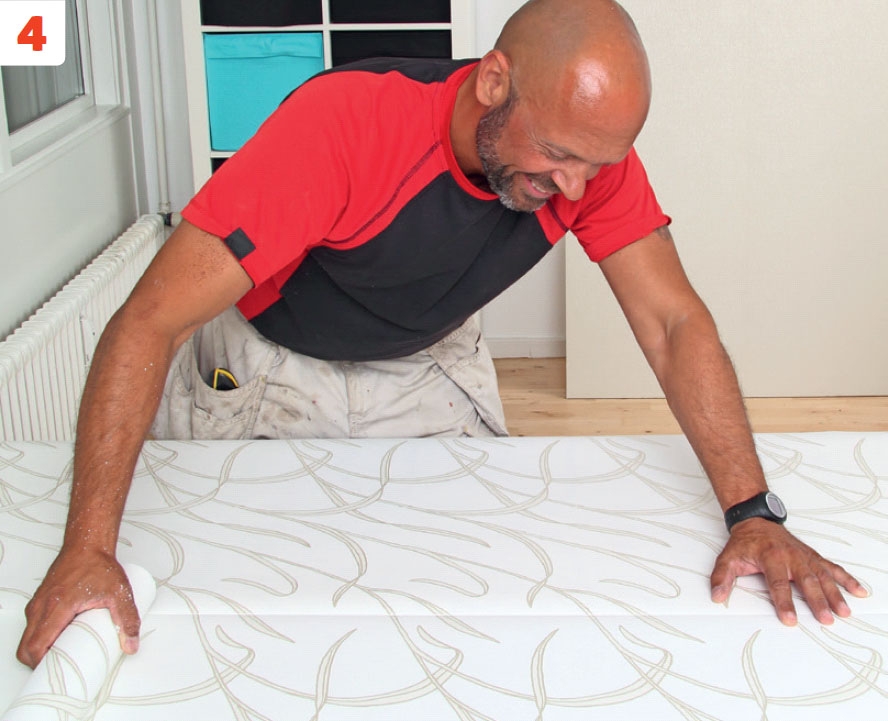 Leikkaa valmiiksi sopiva määrä tapettivuotia. Ota huomioon tapetin kuvio. Voit tehdä vuodista hieman ylipitkät ja leikata liiat pois, kun liisteri on kuivunut. Levitä liisteri joko levyyn tai tapettiin valmistajan ohjeiden mukaan. Asettele ensimmäinen vuota siten, että se yltää hieman reuno-jen yli. Painele tapetti huolellisesti kiinni seinään. Poista ja suorista tapetista varovasti kaikki kuplat ja vekit.