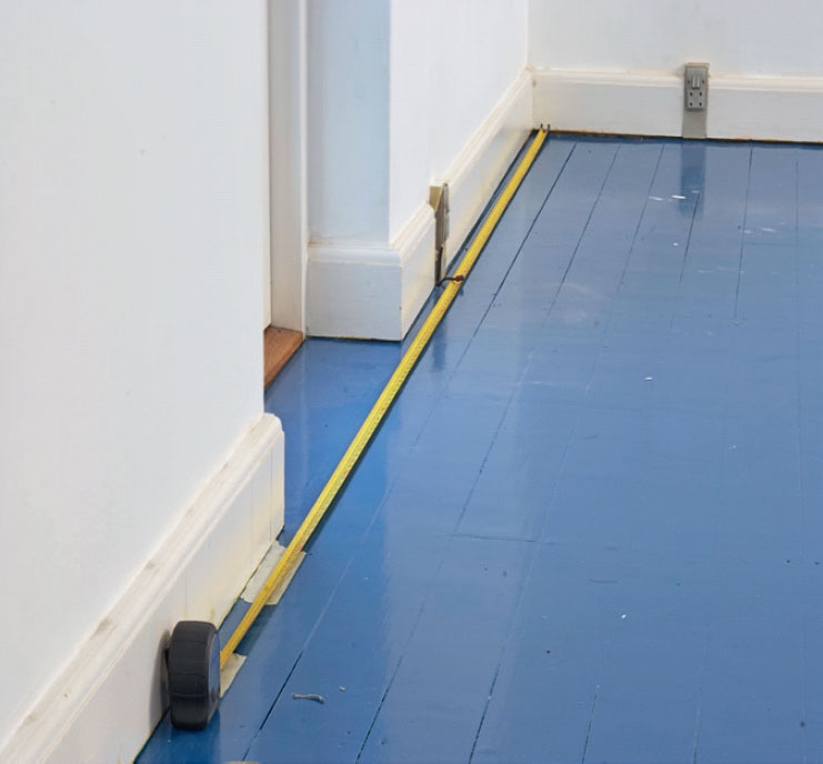 Ota mitta toisesta päädystä ja merkitse seinän paikka. Me kiinnitämme lattiaan maalarinteippiä, jotta voimme piirtää seinän paikan tarkasti vaurioittamatta lattiaa. Merkitsimme väliseinän paikan myös jalkalistoihin.