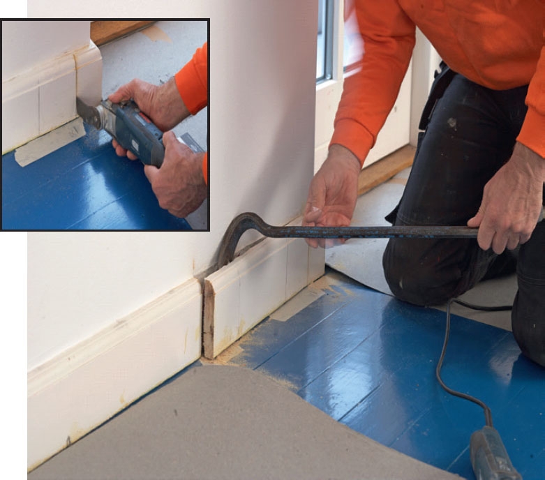 Jalkalista katkaistaan seinän kohdalta. Tämä sujuu helpoiten monitoimityökalulla.