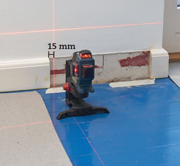 Pystyviiva osoittaa puurungon paikan – 15 mm jalkalistasta, jotta levylle jää tilaa.