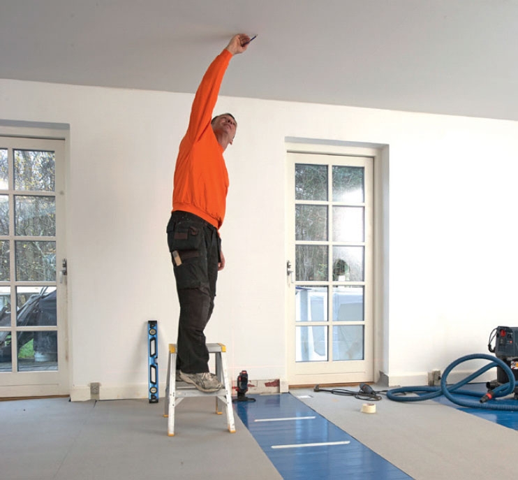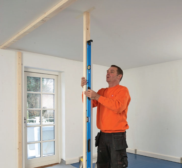 Merkitse seinän paikka, jotta saat sekä kattoon että lattiaan pisteitä, joi-den mukaan voit ohjata rakentamista. Linja-laser on helpoin apuväline, mutta myös ni-velmitta ja suorakulma käy. Tee merkinnät maalarinteippiin, joka on helppo poistaa.