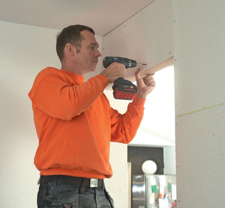 Seinät rakennetaan kuitukipsilevyistä. Näin valmiista seinästä tulee niin luja, että se kestää ripustukset ilman isojen kipsilevyruuvitulppien käyttöä.
