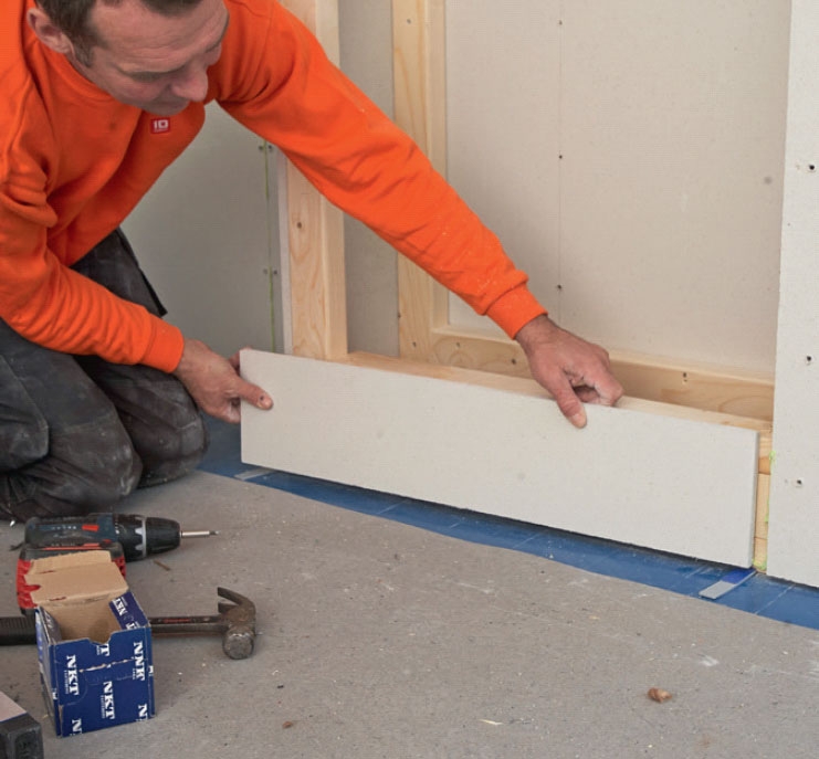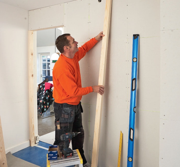 Asenna kuitukipsilevy. Aloitamme takaseinästä, joka sijoittuu toista huonetta vasten. On tärkeää, että levyt aset-tu vat suoraan, joten jos lattia ei ole vaate-rissa, kiilaa levyjä. Kiinnitä levyt 3,9 x 41 mm:n ruuveilla 25 cm:n välein.