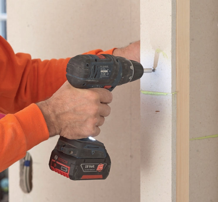 Yläsoiro asennetaan sekä liimalla että ruuveilla, sillä emme voi kiinnittää sitä katon kipsilevyverhoukseen. Jos katossa on puukoolaus, riittää kun kiinnität soiron siihen. Me käytämme asennusliimaa ja 5 x 70 mm:n ruuveja.
