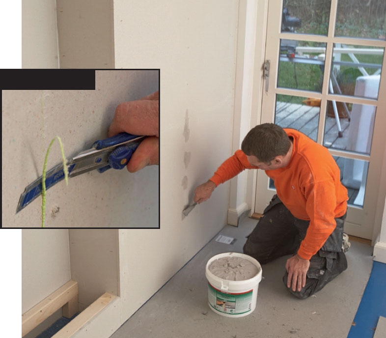Valmistele seinä tasoitusta varten. Poista ylimääräinen saumaliima, kun se on kovettunut vuorokauden. Käytä terävää taittoteräveistä. Puhdista seinä, ennen kuin tasoitat ruuvienreiät 5 cm:n lastan avulla.