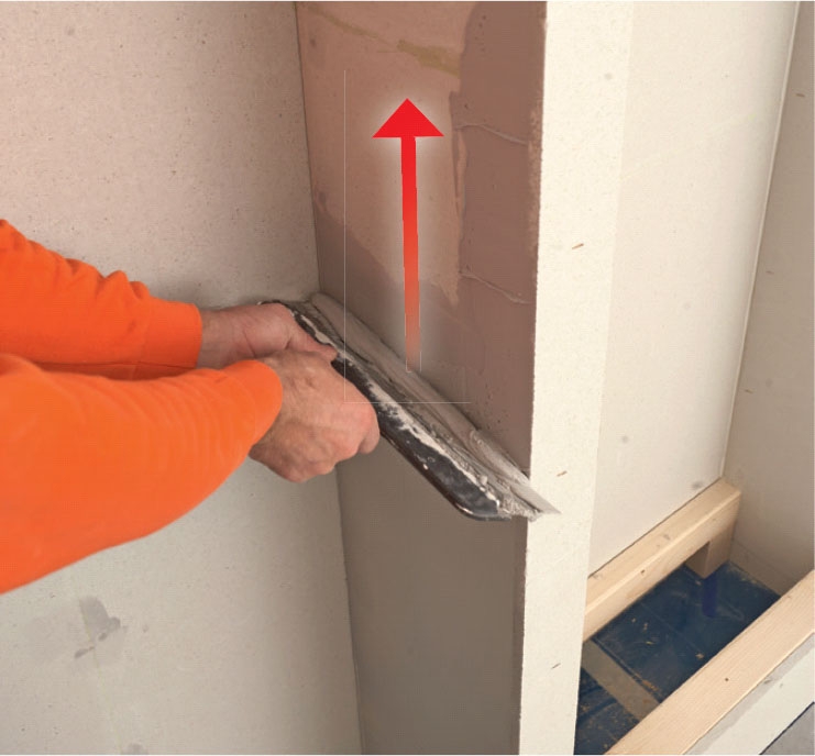 Etusivun kipsilevyt saavat työntyä 1 mm kulman yli, sillä niitä käytetään tasoitereunana. Muista sivellä myös kulmasaumaan saumaliimaa, jotta siitä tulee mahdollisimman luja.