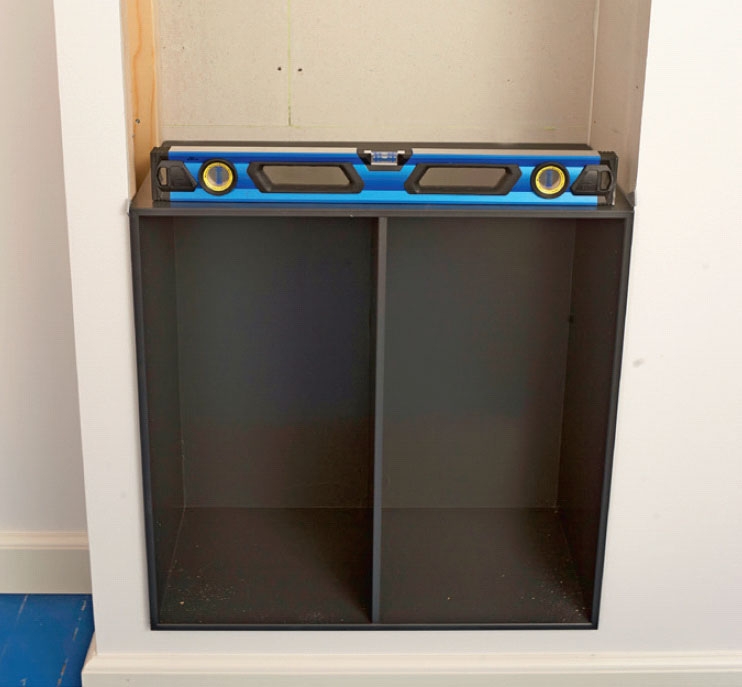 Asenna hyllyköt, kun olet maalannut seinän ja asentanut jalkalistat. Kiilaa alin hyl lyk kö niin, että se seisoo varmasti täysin vaaterissa. Sen alapuolelle jätetään pari millimetriä rakoa, jotta alareuna voidaan saumata.