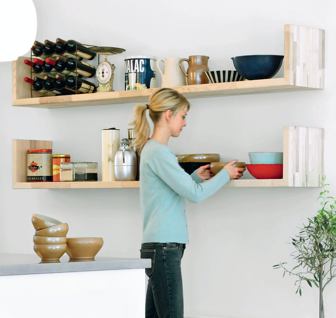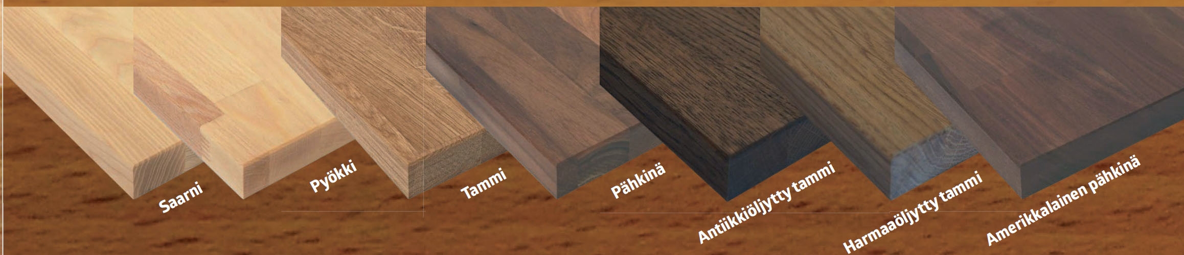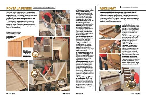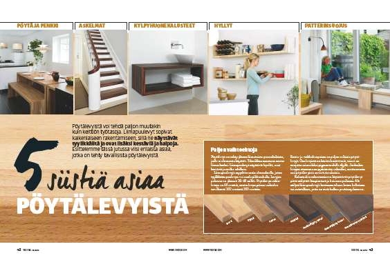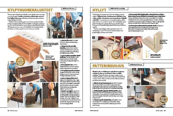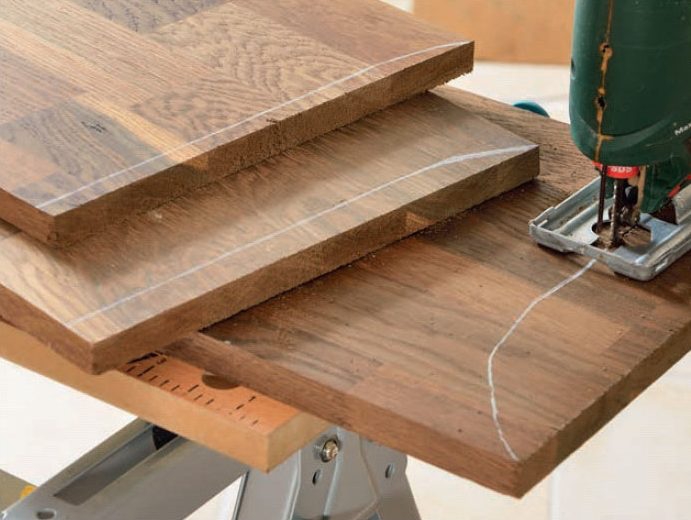 Pöytälevyjä voi käyttää myös tukevien hyllyjen rakenta-miseen. Hyllyistä tulee ainutlaatuisen tyylikkäät, kun niiden nurkat vahvistetaan tummasta puusta tehdyillä suikaleilla. Se vaatii hieman vaivannäköä, sillä nurkkiin pitää sahata urat suikaleita varten. Voit tehdä hyllyt myös yksinkertaisemmin sahaamalla levyjen päät 45 asteen kulmassa ja liittämällä hyllyt yhteen kalustelamelleilla tapeilla.