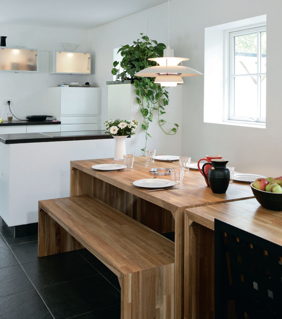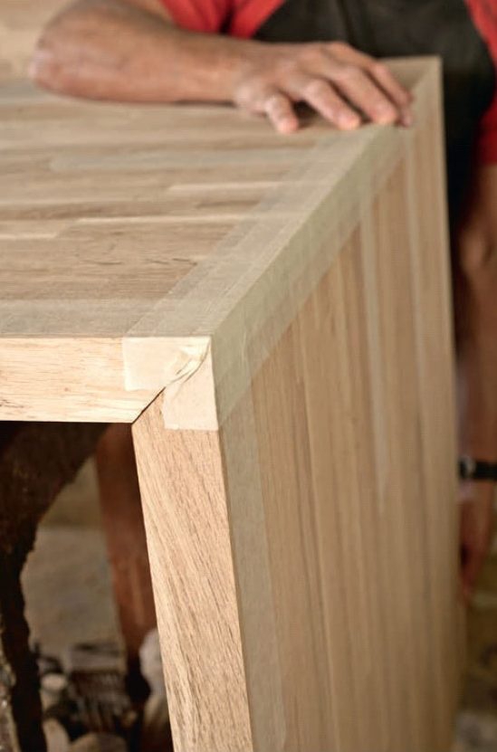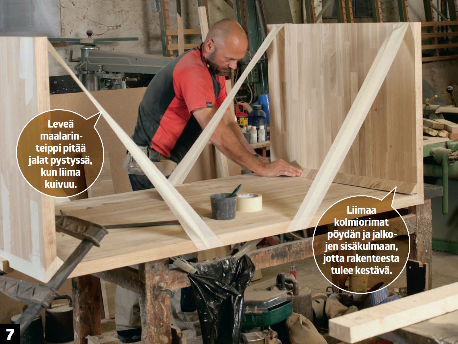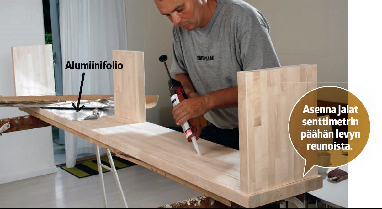 Sekä pöydän että penkin päädyt ovat yhtä leveät kuin niiden kansilevyt. Levyt liitetään toisiinsa 45 asteen kulmassa liimaamalla. Pöydän ja penkkien tekemiseen tarvitaan vain pöytälevyjä, puuliimaa, leveää maalarinteippiä, upotussaha ja ohjainkisko tai pöytäsirkkeli.