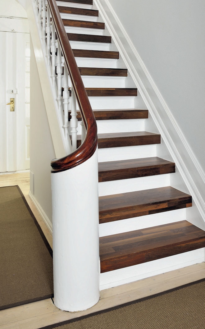 Voit uusia vanhat ja kuluneet porrasaskelmat päällystämällä ne pöytä levynpalasilla. Sahaa liimapuulevyistä askelmien kokoiset palaset. Asenna jokaisen levyn alle kapeat pöytälevynsuikaleet, jotta vanhojen askelmien kuluneet reunat eivät näy levyjen alta. Voit kiinnittää suikaleet huomaamattomasti ja lujasti kalustelamelleilla eli ”kekseillä”. Keksien kolot tehdään lamellijyrsimellä eli levyliittimellä tai yläjyrsimellä. Nämä portaat päällystettiin tummalla ja kovalla puulla, joka sopii hyvin portaiden kaiteisiin.