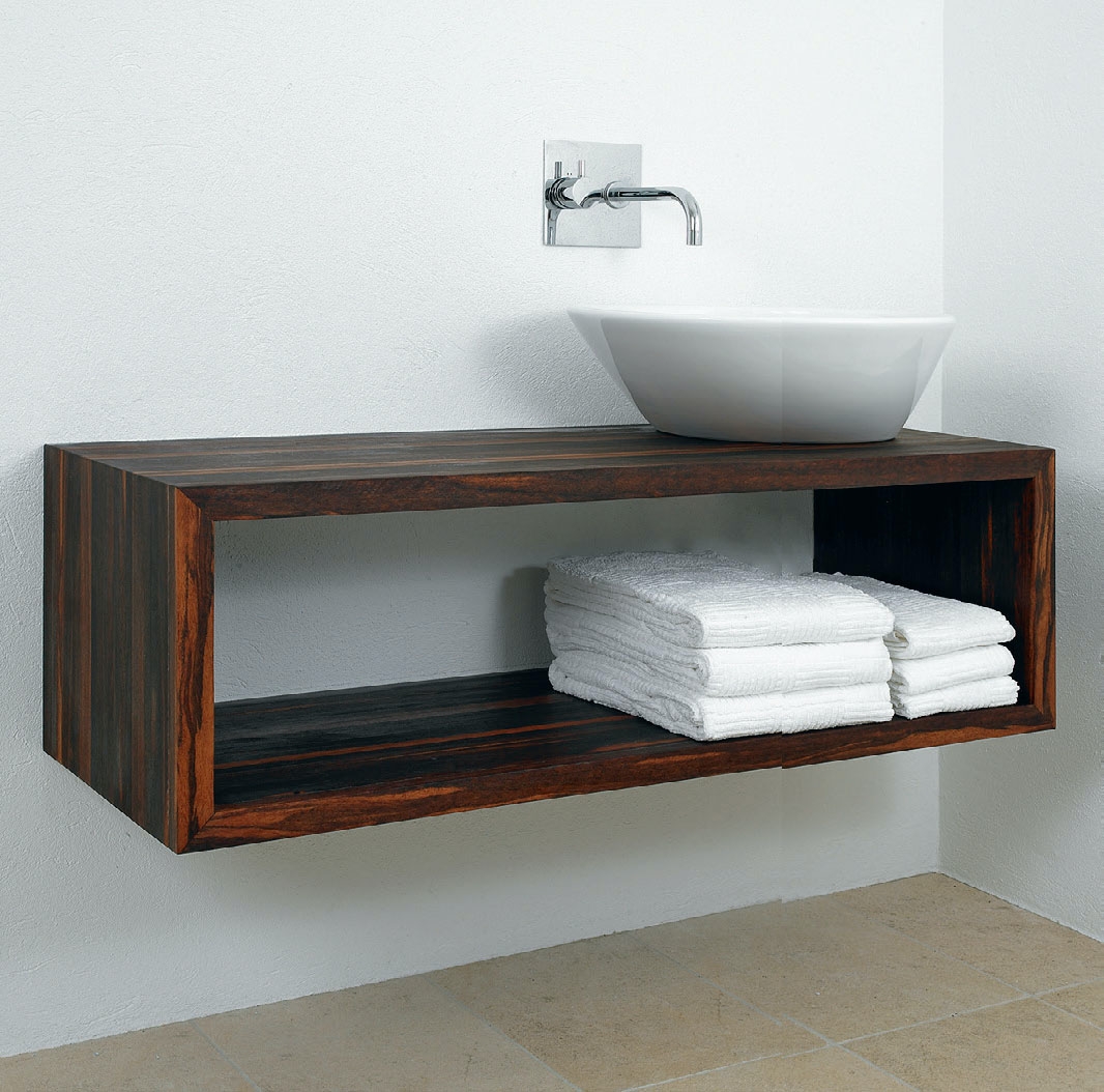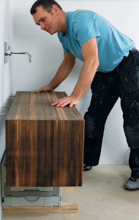 Tässä jutussa rakennetaan kylpyhuoneen allaskaappi tummasta ruusupuulevystä. Laatikon muotoinen allaskaappi on taval-lista hyllyä tukevampi, sillä altaan ja kalusteen paino jakautuu myös alahyllyn kohdalle.
