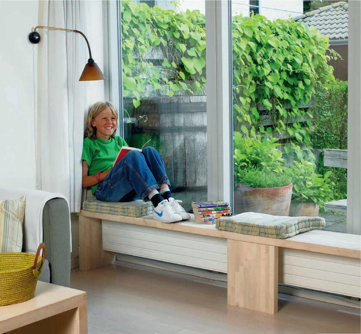 Pöytälevystä voi tehdä myös nykyaikaisen patterin suojuksen, joka on niin kestävä, että sen päällä voi istua. Levy halkaistaan pituussuunnassa, ja siitä tehdään päätylevy, jonka molemmissa päissä ja keskellä on jalat. Levyn takareuna kiinnitetään ikkunan karmiin pienillä kulmaraudoilla.