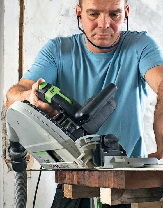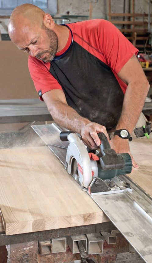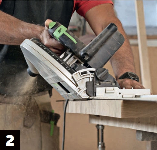 Paina pöytälevyt tiukasti toisiaan vasten ja purista ne kiinni työ pöytään parilla puristimella. Säädä upotussahan terä siten, että se yltää 3-4 milliä levyn läpi. Purista ohjain kisko kiinni levyyn ja sahaa yhteen liimattavat reunat suoriksi. Käytä pienihampaista terää ja varmista, että terä osuu kumpaankin levyyn.