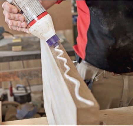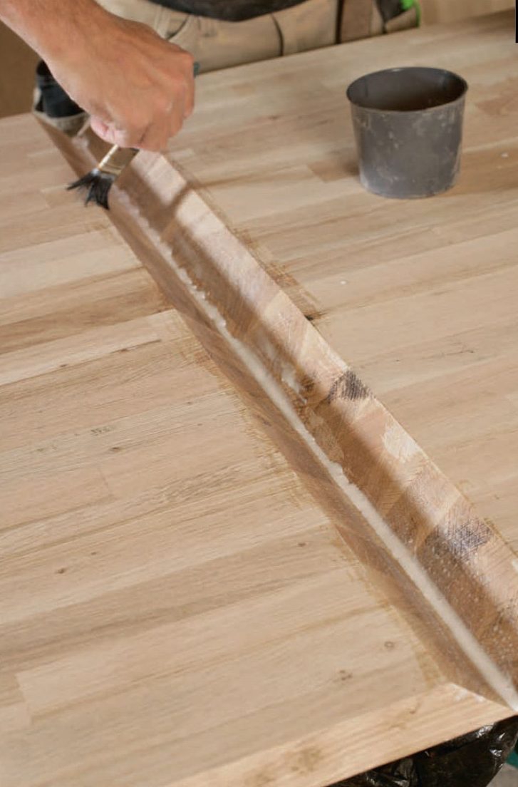 Levitä saumaan liimaa, kun pääty levy on pöydän alapuolella. Levitä molemmille pinnoille aluksi hieman laimennettua puuliimaa ja lisää sen päälle kerros laimentamatonta liimaa. Levitä liimaa niin paljon, että se tihkuu ulos saumoista. Se kertoo, että liimaa on tarpeeksi. Voit poistaa ylimääräisen liiman taltalla sen jälkeen, kun liima on kuivunut.