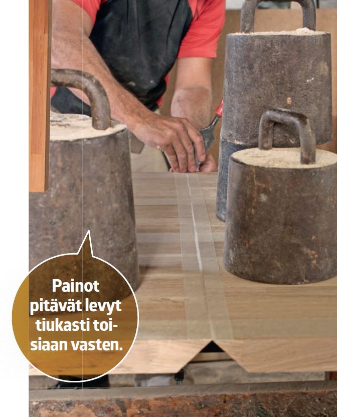 Pöytälevyt pitää sahata suoriksi ennen liimaamista. Sahaamiseen pitää käyttää uutta ja terävää terää, jotta liitoksesta tulee huomaamaton ja kestävä.