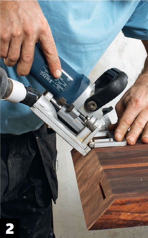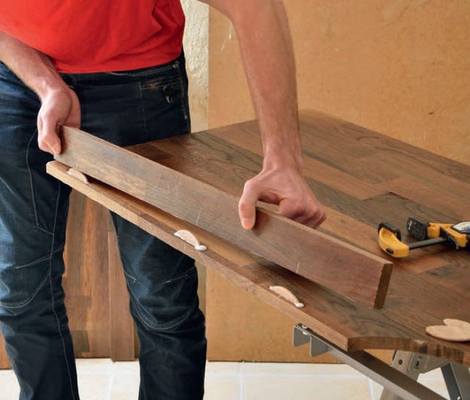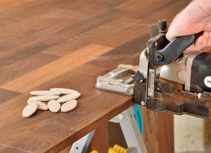 Sahaa urat niin sanotuille kekseille, joita tarvitaan nurkka liitosten vahvistamiseen. Jyrsi urat lamellijyrsimellä eli levyliittimellä ja kiinnitä keksit puuliimalla.