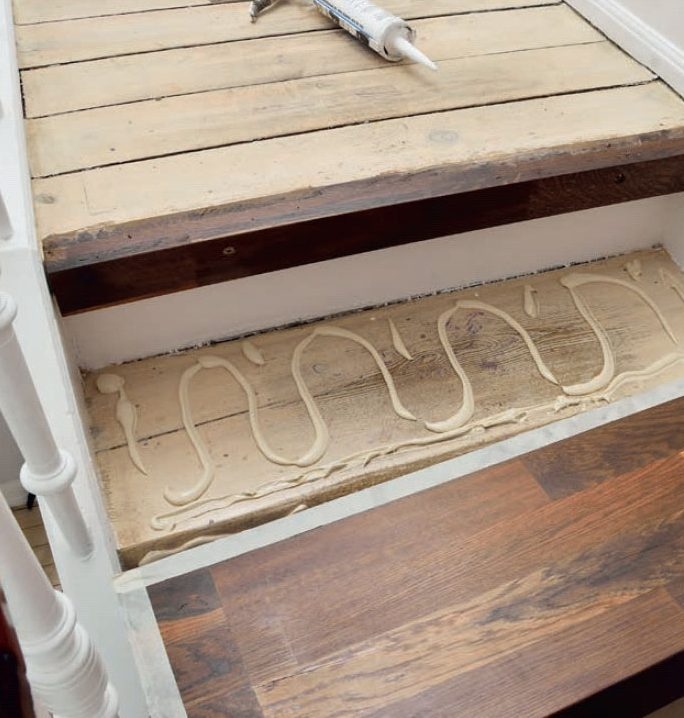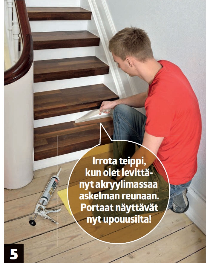 Liimaa levyt kiinni askelmiin asennusliimalla. Liimaa teippi levyn reunaan ennen asentamista, jotta voit saumata askelman reunan siististi.