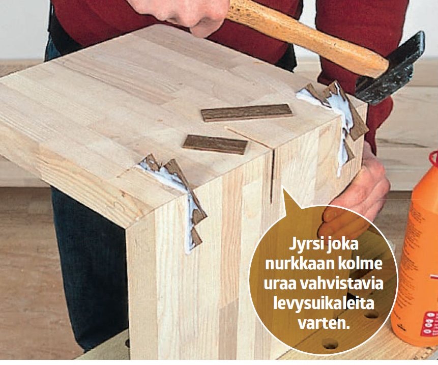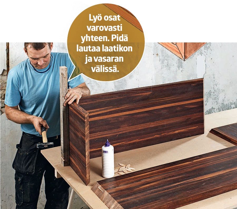 Levitä laatikon saumoihin reilusti puuliimaa. Purista kalusteen osat yhteen isoilla puristimilla. Käytä välissä paria lautaa, jotta levyihin ei tule koloja.