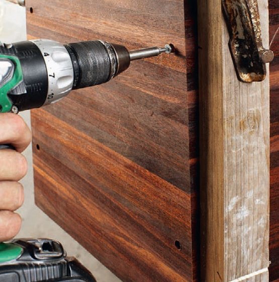 Poraa levyihin reiät 12 millin oksaterällä. Asenna reikiin ruuvit ja peitä ne myöhemmin puutulpilla.