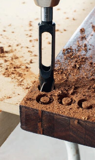 Poraa ylijäämäpuusta puutulpat ja asenna ne koloihin liimalla. Sahaa tulpat poikki, kun liima on kuivunut. Poista ylimääräinen puuliima.