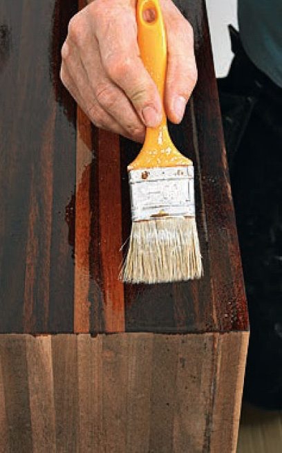 Liimaa päädyt kiinni hyllylevyihin, sahaa jokaiseen nurkkaan kolme uraa ja asenna uriin pienet, tummasta puusta tehdyt listat. Sahaa urat käsisirkkelillä, jonka pohja on puristettu kiinni hyllyyn. Säädä sirkkelin terä oikeaan syvyyteen (tässä 3 senttiä). Levitä jalo-puulistoihin liimaa ja lyö listat uriin vasaralla. Yhteen uraan lyödään monta suikaletta. Anna liiman kuivua vuorokauden ajan.