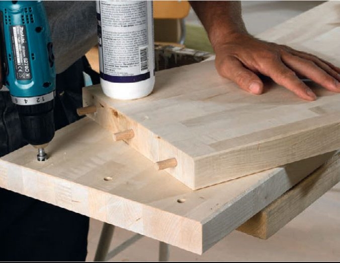 Yhdistä kansilevy ja jalat toisiinsa tapeilla. Käytä tappimerkitsintä reikien paikkojen piirtämiseen. Poraa reiät pystysuorassa, jotta tapit menevät helposti paikoil-leen. Asenna jalat senttimetrin päähän levyn reunoista ja liimaa ne kiinni.