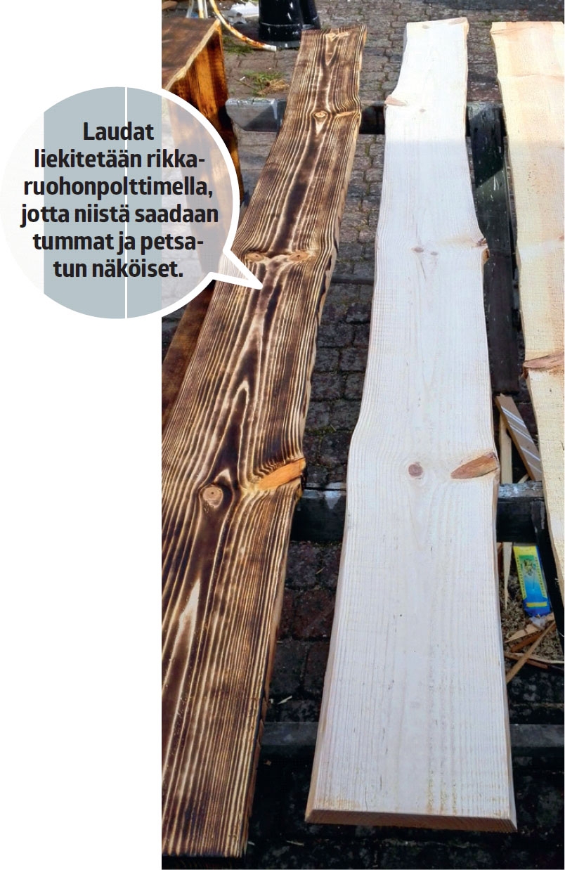 Sahaa laudat sopivan mittaisiksi ja suorista niiden seinän puoleiset reunat. Lautojen etureunat saavat jäädä epätasaisiksi ja elävän näköisiksi. Voit polttaa lautoihin tumman sävyn rikka-ruohonpolttimella. Hio pinta polttamisen jälkeen ja viimeistele se lakkaamalla.