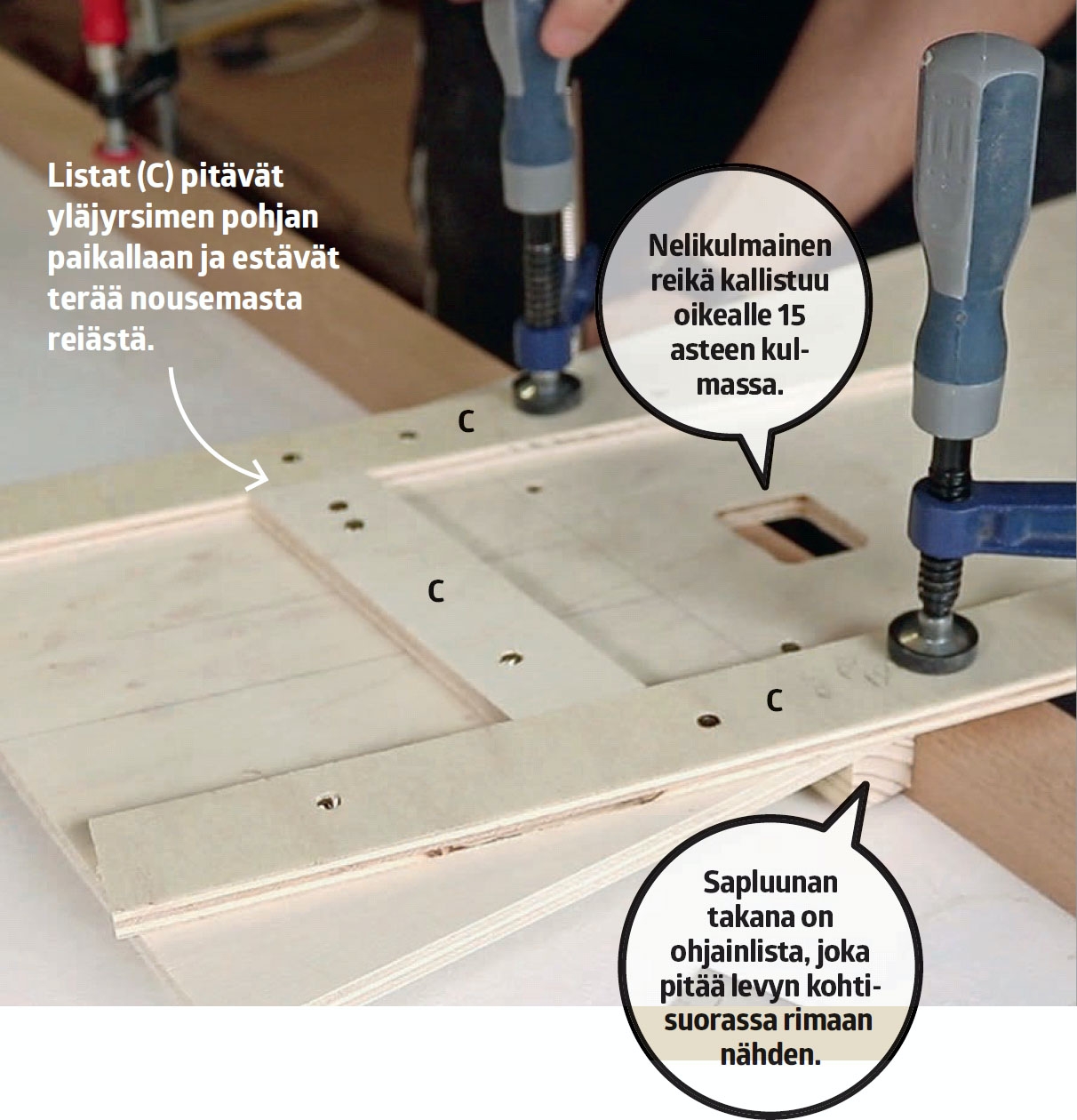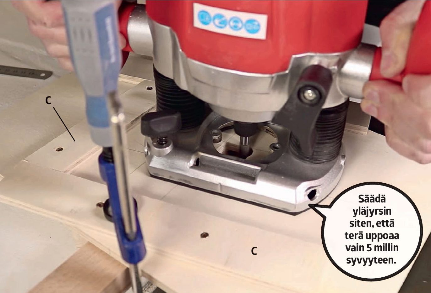 Reunalistat (C) pitävät yläjyrsimen paikallaan. Kolo on oikean kokoinen, kun yläjyrsimen pohja osuu reunalistaan.