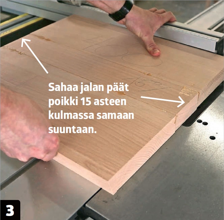 Sahaa jalkojen ylä- ja alapäät 15 asteen kulmassa. Piirrä kolojen paikat. Voit käyttää tässä vaiheessa toista jalkaa rimasapluunan piirtämiseen. Se on helppo tapa varmistaa, että kulmat tulevat oikein päin.