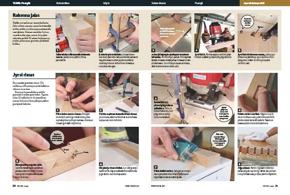 Piirrä kolon muoto rimaan. Rimojen molempiin päihin jyrsitään kolot, jotka sopivat yhteen jalkojen kanssa. Jokaiseen rimaan jyrsitään neljä koloa.