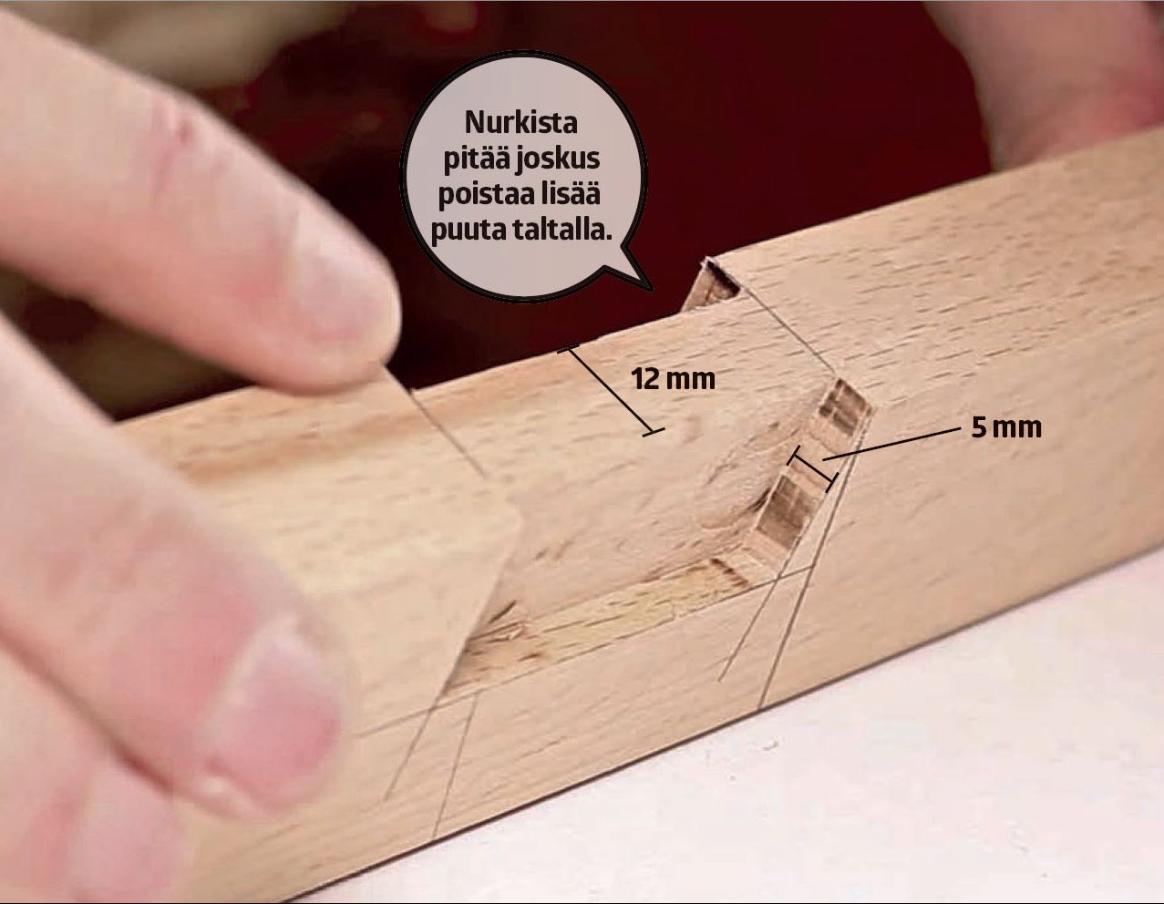 Veistä nurkat suoriksi. Yläjyrsin ei yllä aivan nurkkaan asti, joten viimeiset millit pitää veistää terävällä taltalla. Tässä vaiheessa pitää olla todella tarkkana.
