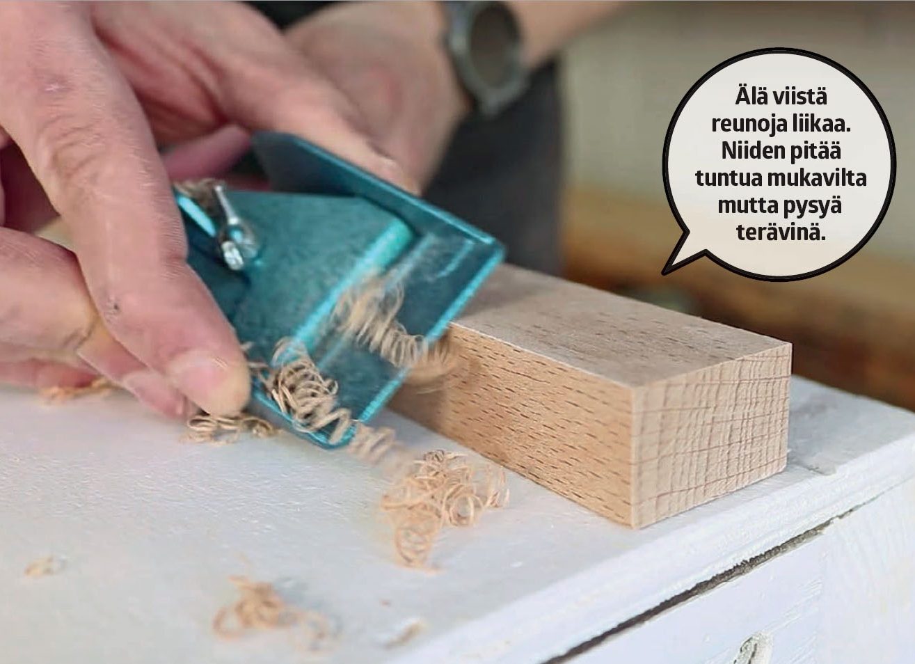 Viistä kaikki nurkat. Jalkojen ja rimojen reunojen pitää olla sileitä. Viistämiseen käytetään terävää viistehöylää.