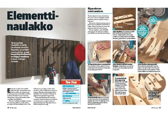Naulakkoelementti koostuu pysty rimoista ja niiden väliin asennettavista ripustimista. Ripustimet ja rimat kootaan yhteen kahdella kierretangolla. Sekä ripustimiin, rimoihin että väli listoihin porataan reiät tarkasti samoi hin kohtiin. Ripustinten (A) reiät porat tiin jo aiemmin, joten nyt on rimojen (B) ja välilistojen (C) reikien vuoro.