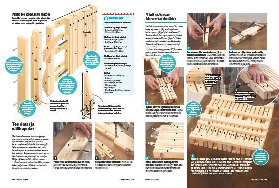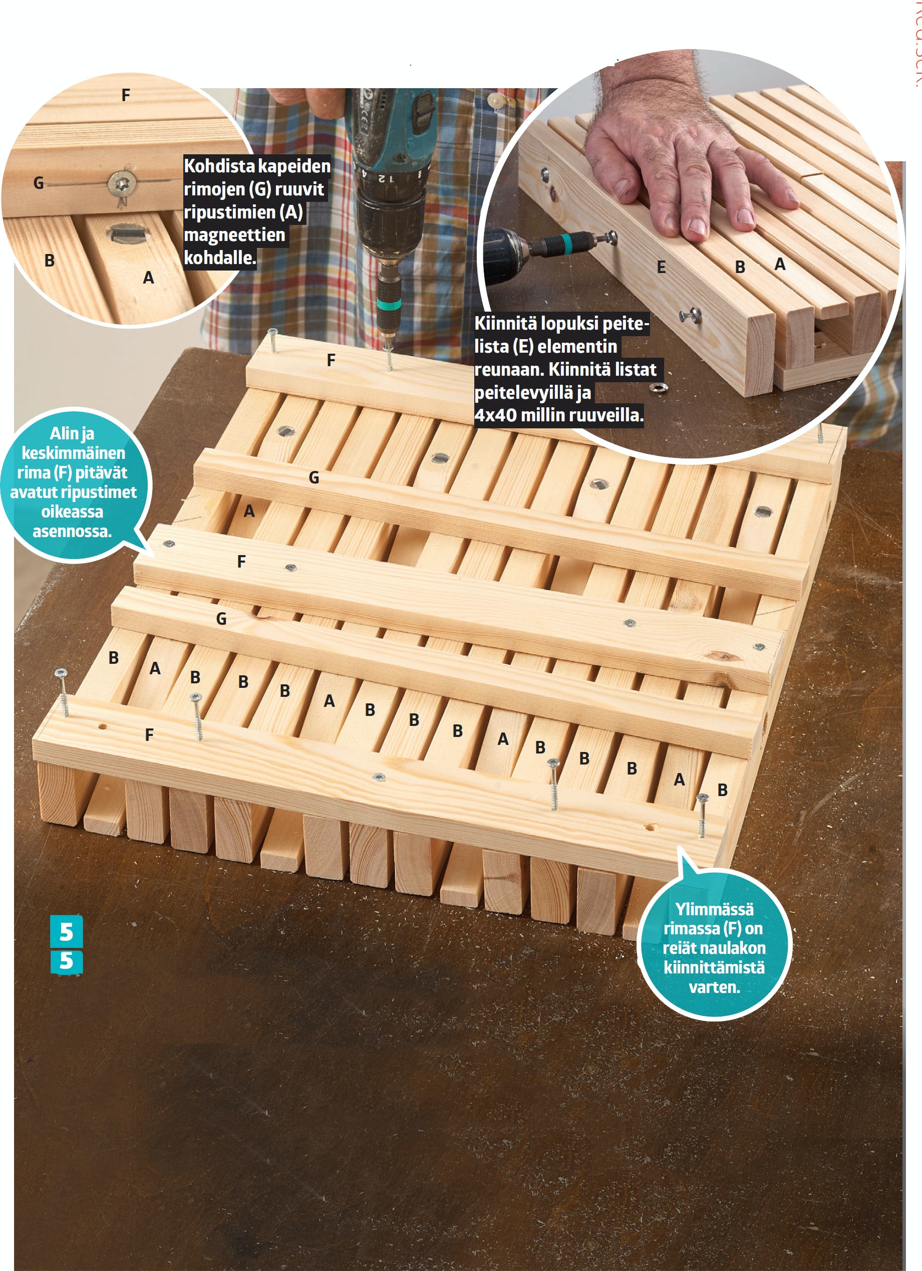 Tee elementti kolmesta rimasta (B) ja kahdesta välilistasta (C). Liimaa aluksi väli lista (C) kiinni rimaan (B). Lisää elementtiin vielä kaksi rimaa ja yksi välirima. Pidä osat väliaikaisesti paikallaan poranterillä.
