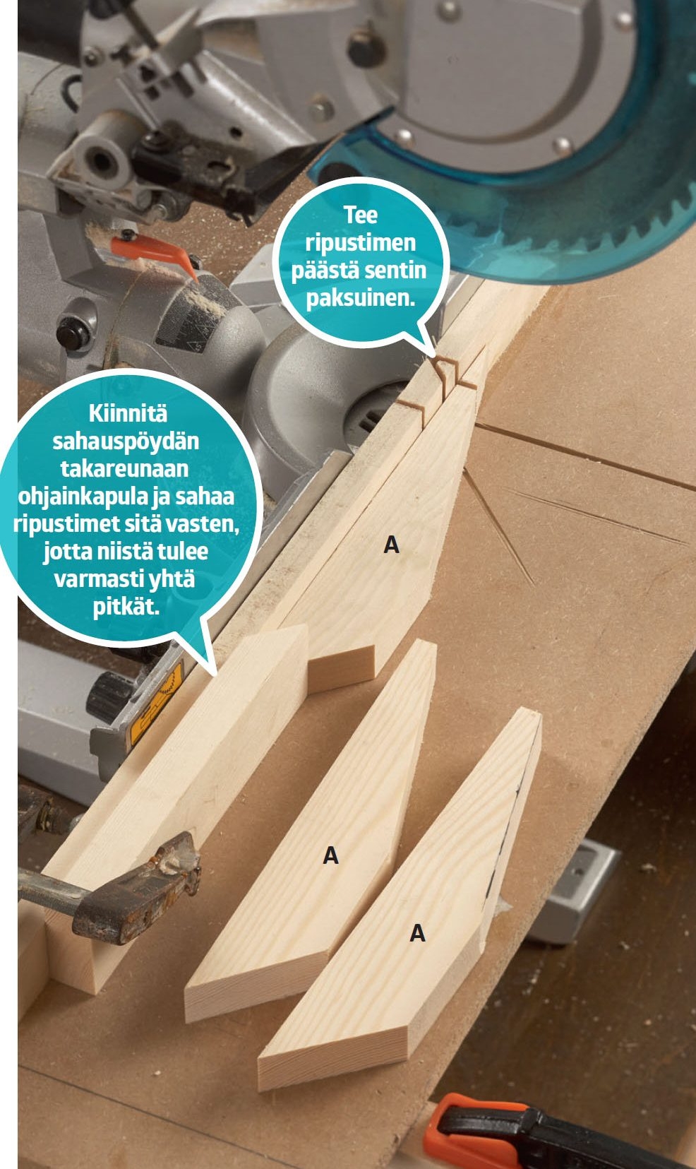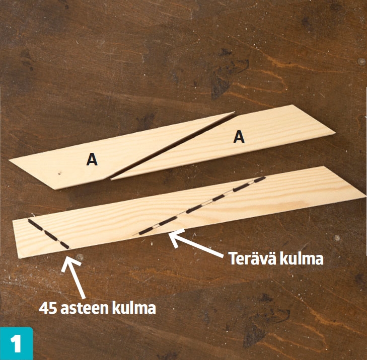 Sahaa ripustinten (A) päät samassa kulmassa. Säädä katkaisu- ja jiirisirkkeli 45 asteen kulmaan ja sahaa ripustimet viivoja pitkin.