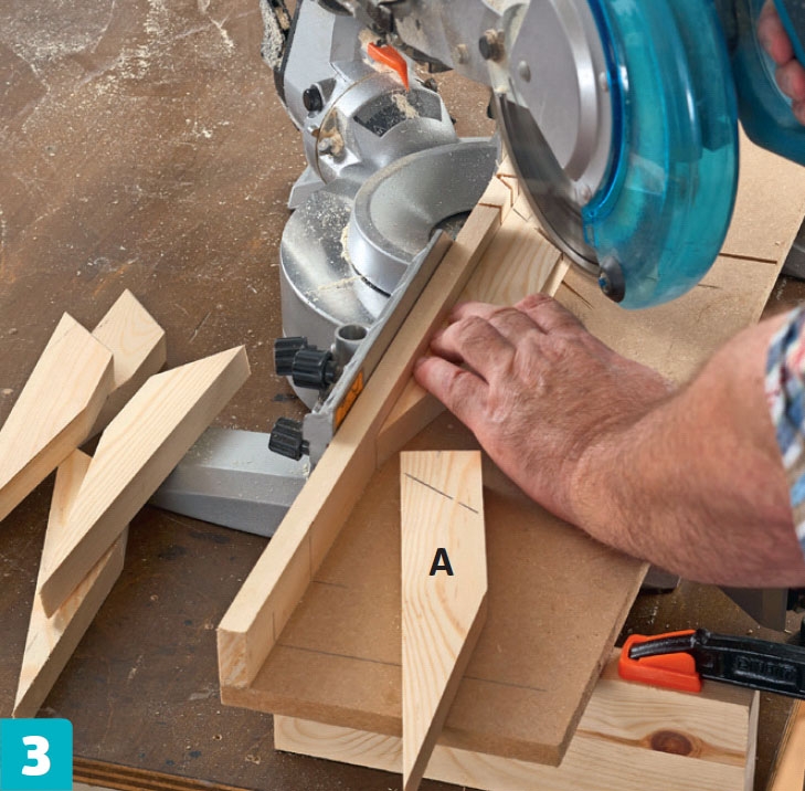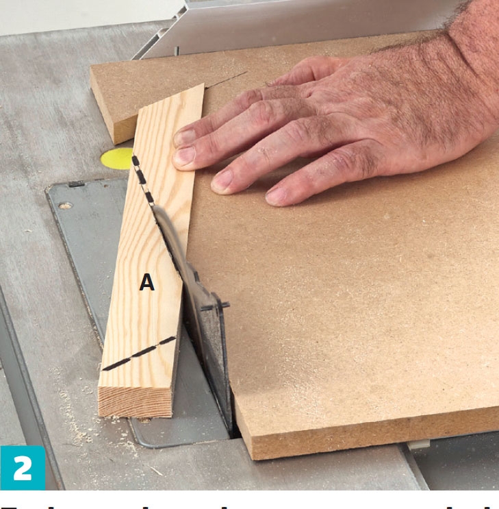 Tee levysapluuna, jossa on 45 asteen lovi. Paina ripustimen (A) 45 asteen kulmaan sahattu pää loven pohjaan ja sahaa listan toinen pää pöytäsirkkelillä.