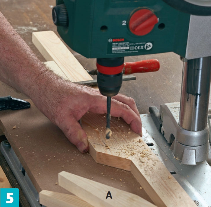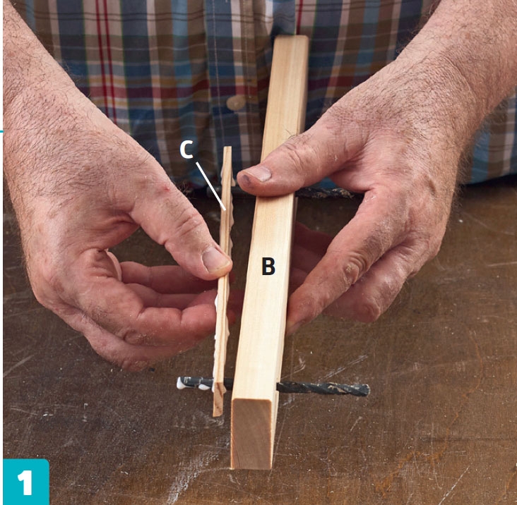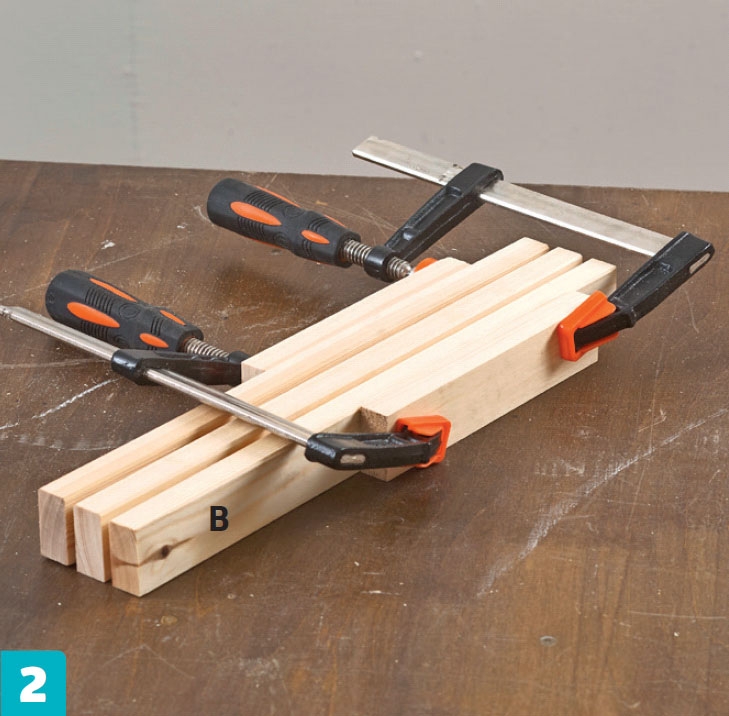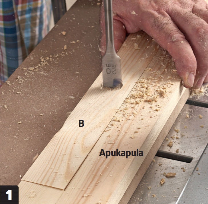 Purista rimat (B) yhteen puristimilla, kunnes liima kuivuu. Irrota poranterät, kun olet puristanut rimat lujasti yhteen. Aseta puukapulat puristinten ja rimojen väliin, jotta rimoihin ei jää jälkiä.